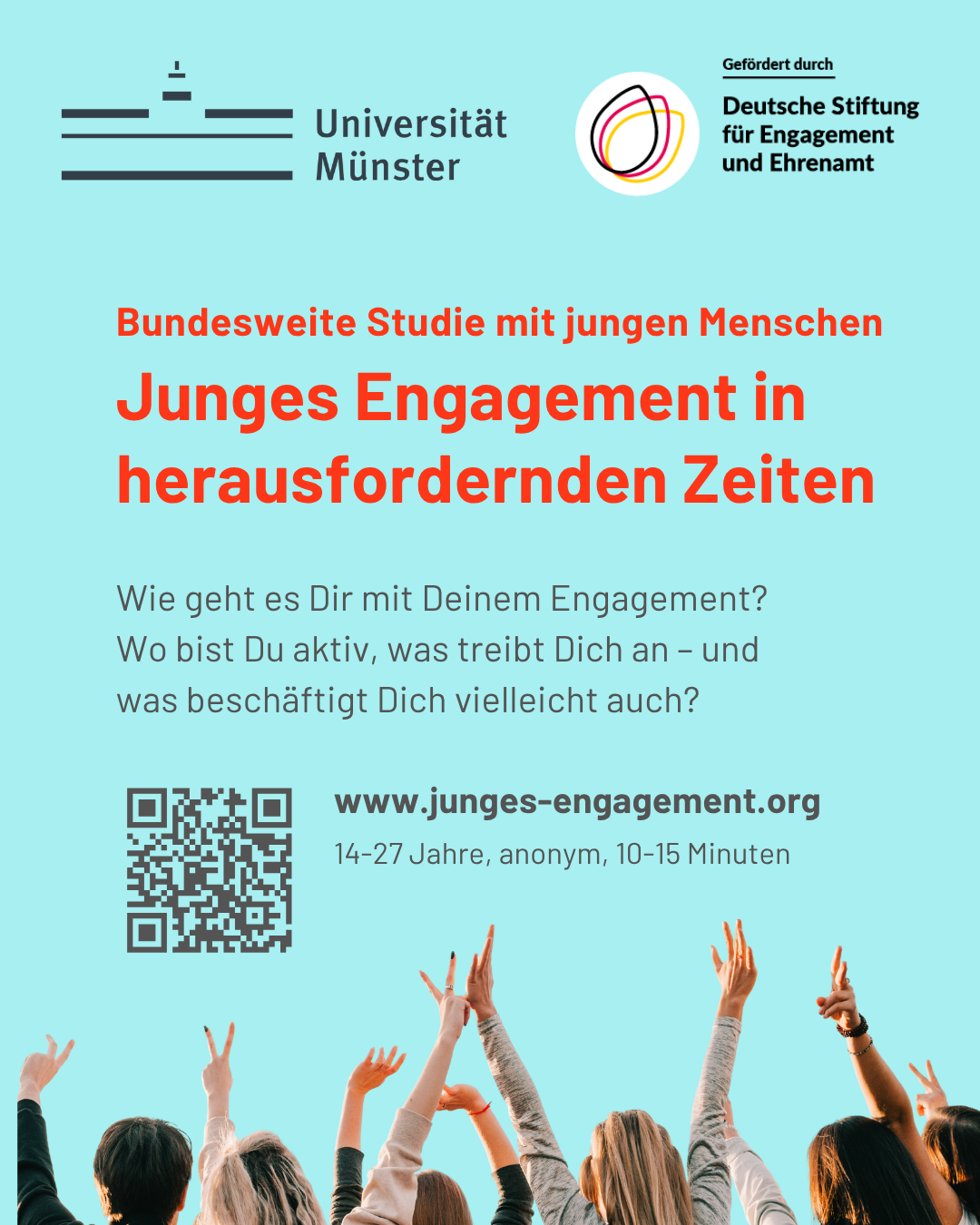 Die Onlinebefragung richtet sich an alle engagierten 14- bis 27-Jährigen, unabhängig davon, wie intensiv sie engagiert sind oder welche Erfahrungen sie gemacht haben. Die Teilnahme ist anonym und dauert rund 10 bis 15 Minuten. Befragungslink: https://www.junges-engagement.org
