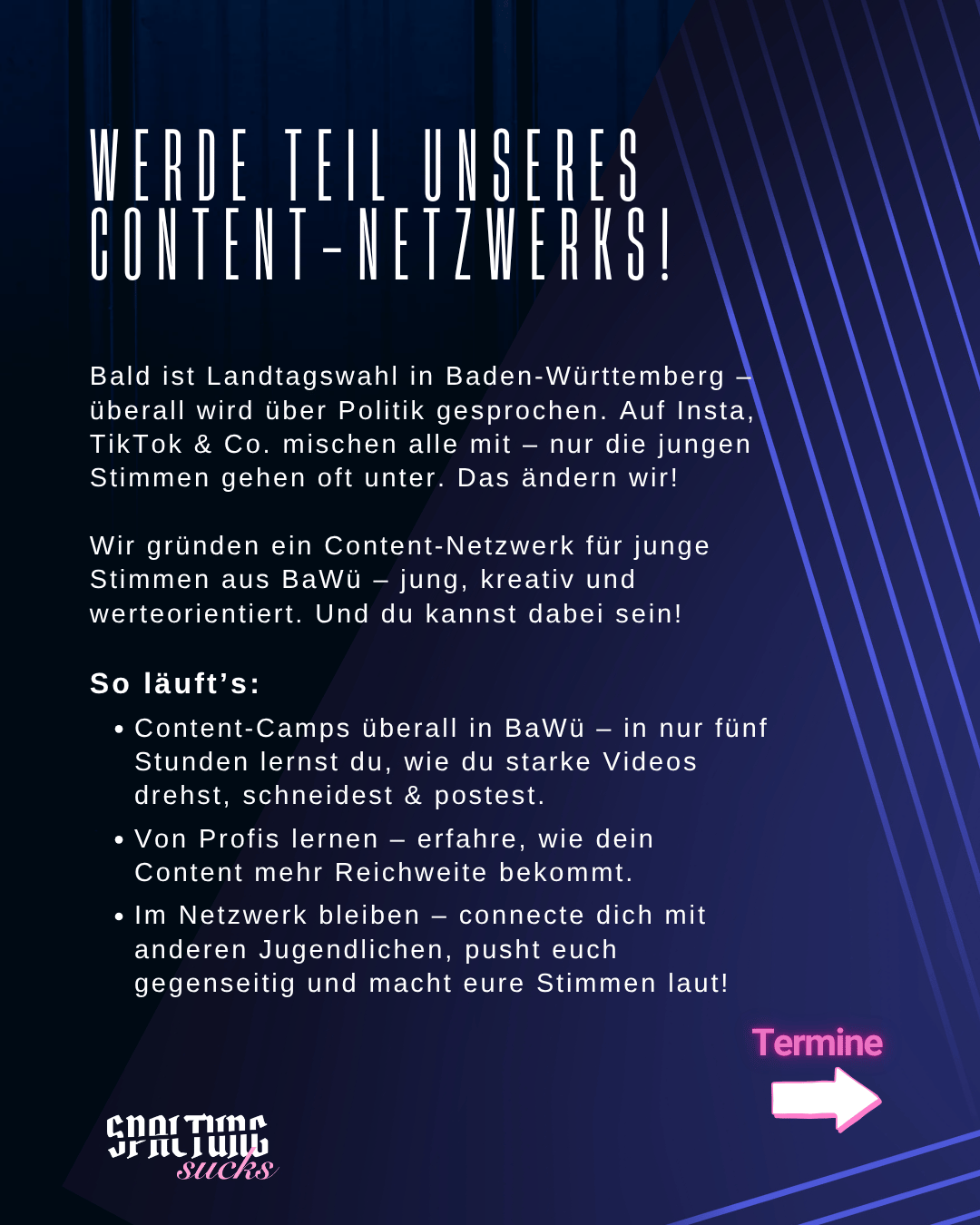 Ein Baustein dieser Kampagne besteht in der Etablierung eines Content-Creator*innen-Netzwerks. Denn viele reden über Politik. Auf Insta, TikTok & Co., aber insbesondere junge Stimmen werden oft nicht gehört. Wir wollen das ändern: Deine Meinung soll raus in die Welt! Genau dafür gründen wir nun ein Content-Netzwerk für junge Stimmen aus BaWü - jung, kreativ und werteorientiert.