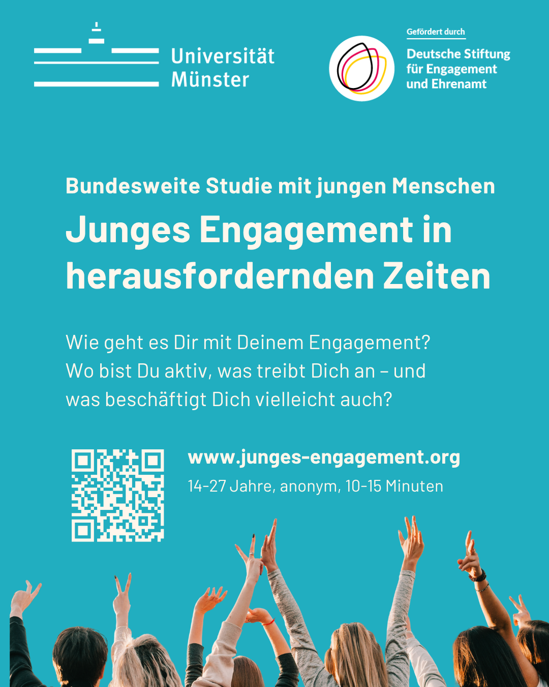 Junge Menschen engagieren sich auf vielfältige Weise. Viele erleben Gemeinschaft und Anerkennung; manche machen aber auch Erfahrungen mit Anfeindungen oder Belastungen. Die Universität Münster führt, gefördert von der Deutschen Stiftung für Engagement und Ehrenamt (DSEE), eine bundesweite quantitative Studie zu jungem Engagement durch. Jugendliche und junge Erwachsene wurden zuvor qualitativ befragt und haben an der Erstellung des Fragebogens mitgewirkt.
