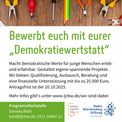 Im Programm gründen Jugendgruppen und -organisationen eigene, kleine oder große „Wertstätten der Demokratie“! Ein Programm der Baden-Württemberg-Stiftung, durchgeführt vom Landesjugendring.