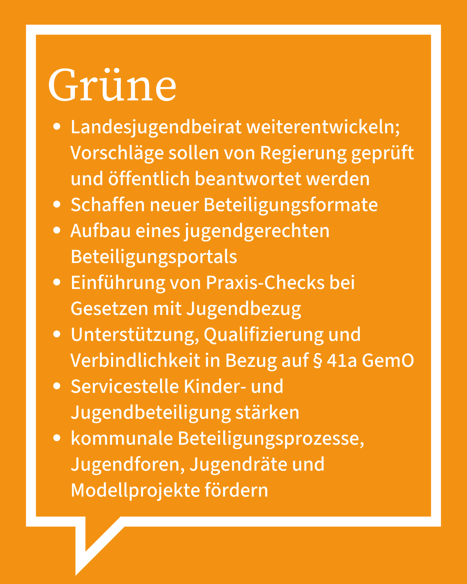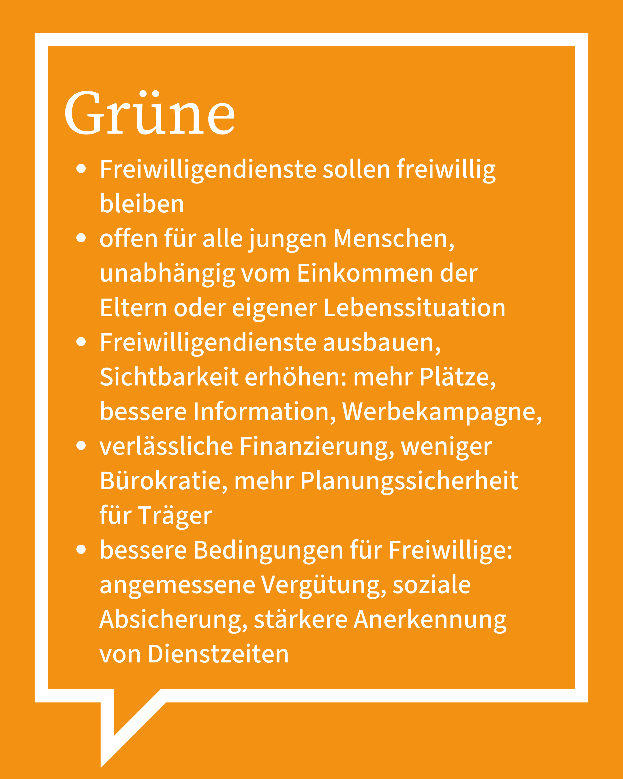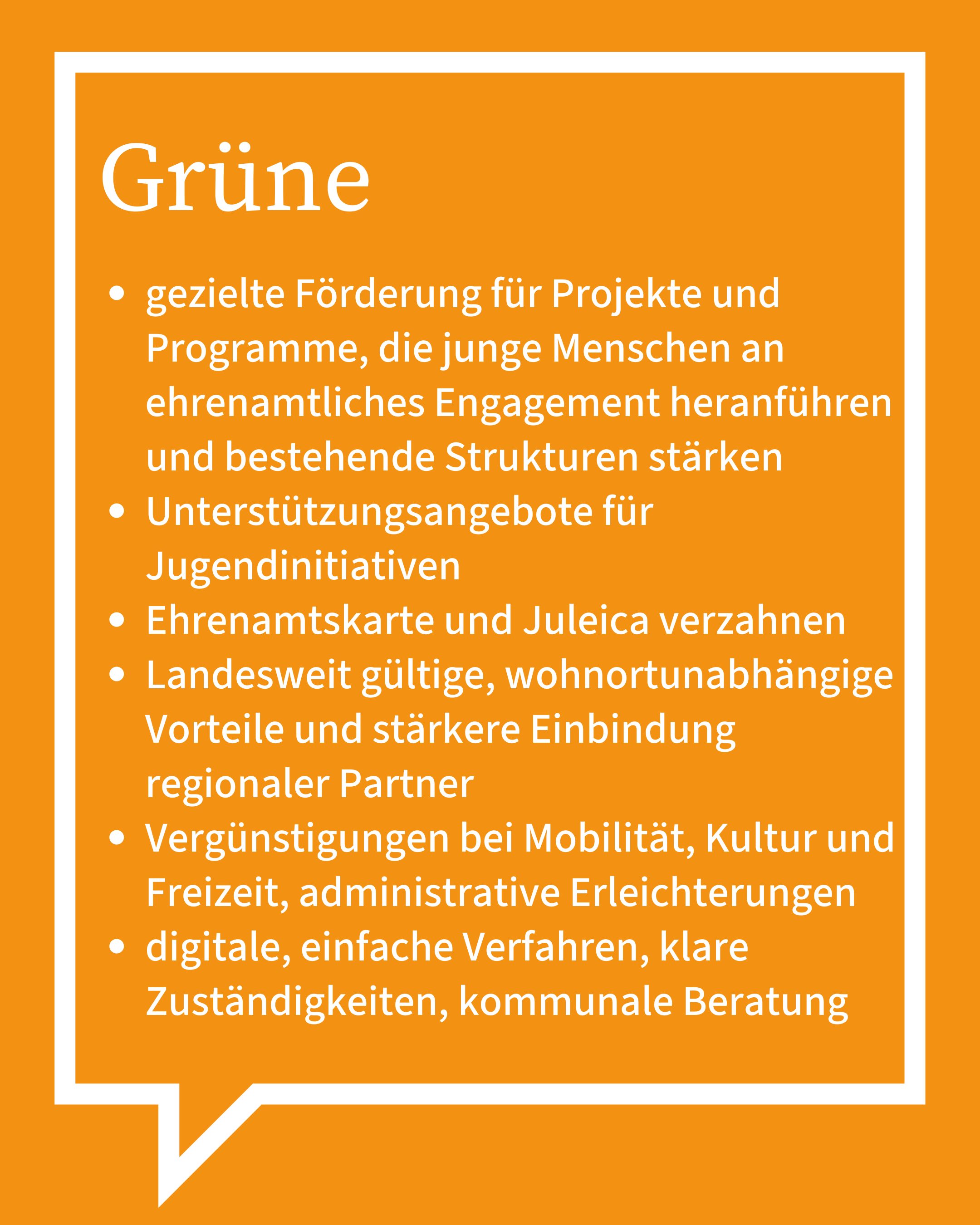 Ein zentrales Anliegen der GRÜNEN ist außerdem der Abbau von Bürokratie im Ehrenamt. Junge Menschen sollen ihre Zeit für Projekte, Menschen und Ideen einsetzen können, nicht für Formulare. Deshalb setzen wir uns für vereinfachte und verständliche Antrags- und Abrechnungsverfahren ein, etwa bei Fördermitteln.