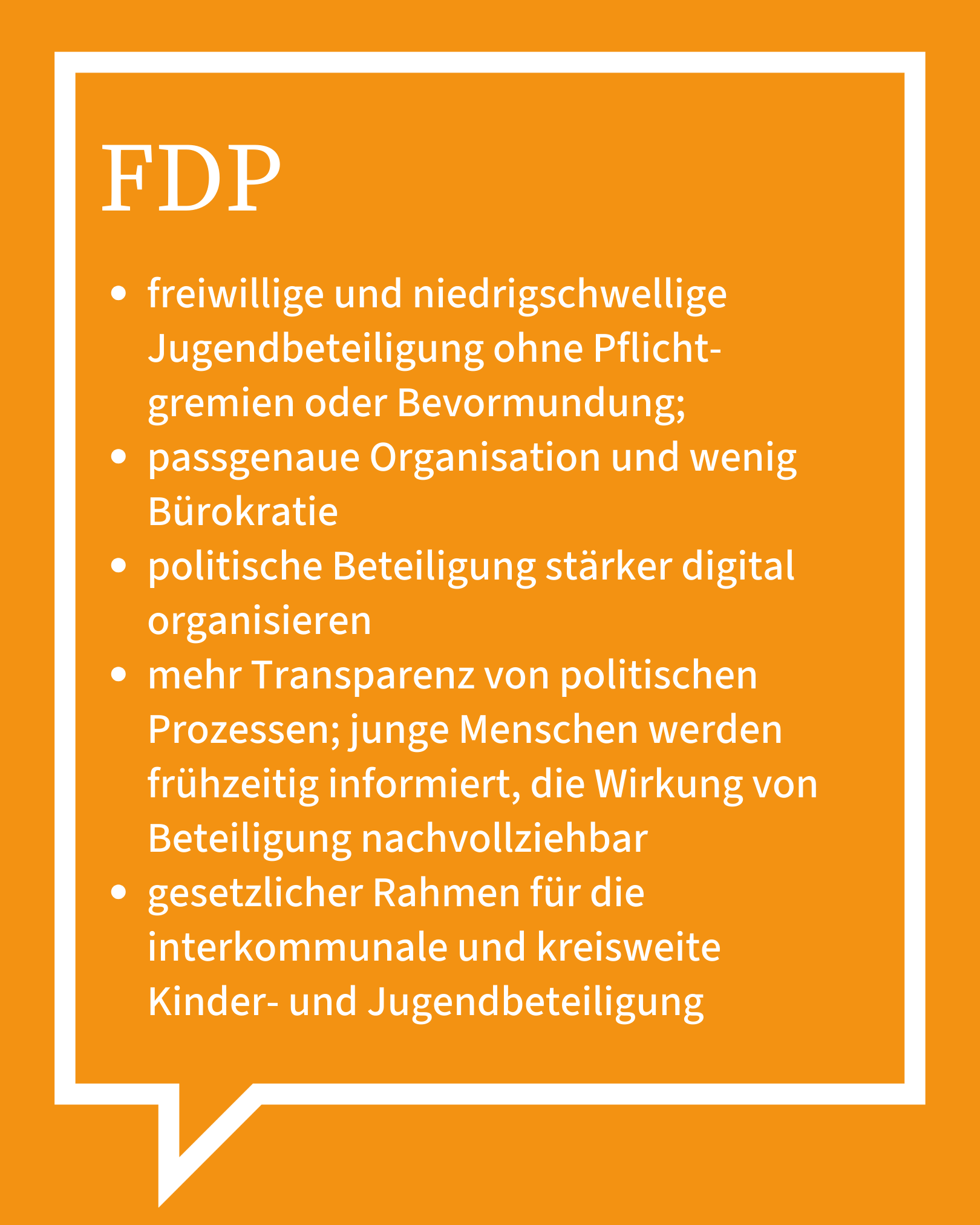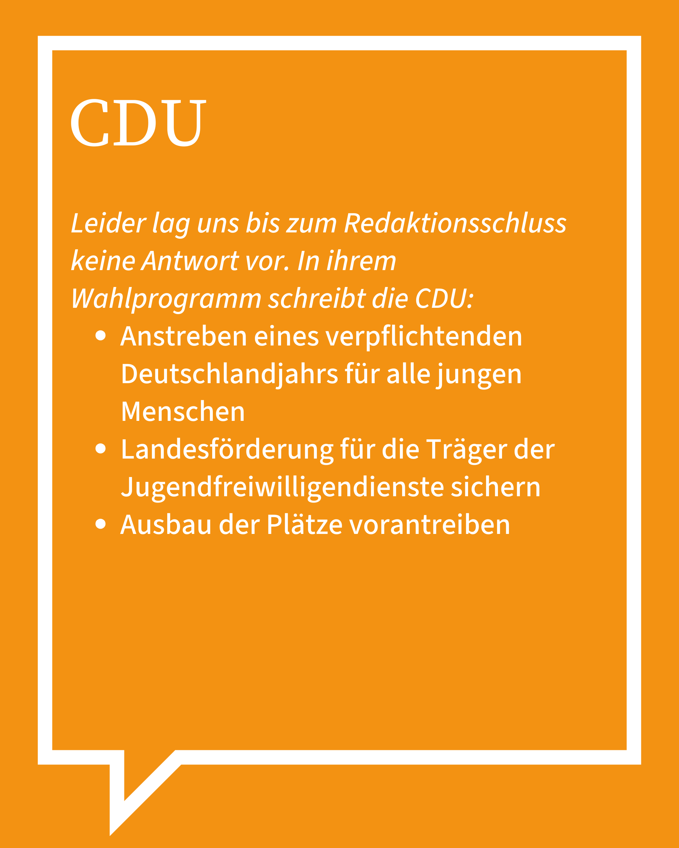 Digitale Prozesse, klare Zuständigkeiten und transparente Verfahren sollen den Aufwand deutlich reduzieren. Ergänzend wollen wir Beratung und Unterstützung ausbauen, zum Beispiel durch feste Ehrenamtsansprechpartner*innen in Stadt- und Landkreisen. Bürokratieabbau und eine Kultur der Anerkennung gehen für uns Hand in Hand, damit ehrenamtliches Engagement für junge Menschen attraktiv, machbar und wertgeschätzt bleibt.