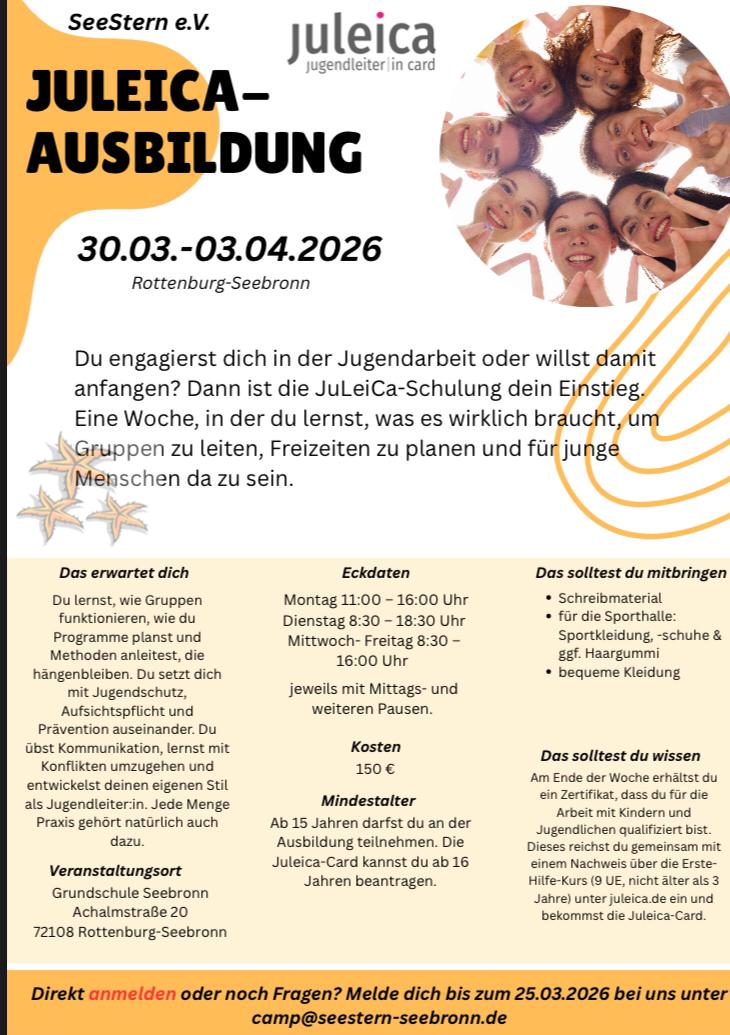 Die Schulung findet vom 30. März bis 3. April 2026 statt und richtet sich an alle, die sich in der Jugendarbeit engagieren oder einsteigen möchten. Neben den Grundlagen zur Leitung von Gruppen und Planung von Angeboten werden auch zentrale Themen wie Aufsichtspflicht, Prävention, Kommunikation und der Umgang mit Konflikten behandelt. Weitere Infos sind im beigefügten Flyer.