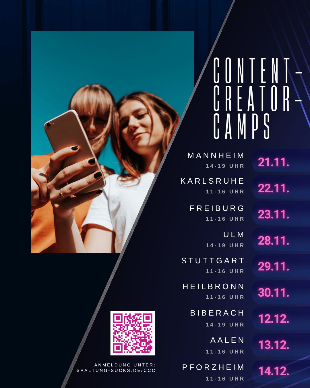 • In Content-Camps in ganz BaWü lernst du an nur einem Tag, wie man starke Videos dreht, schneidet und postet.